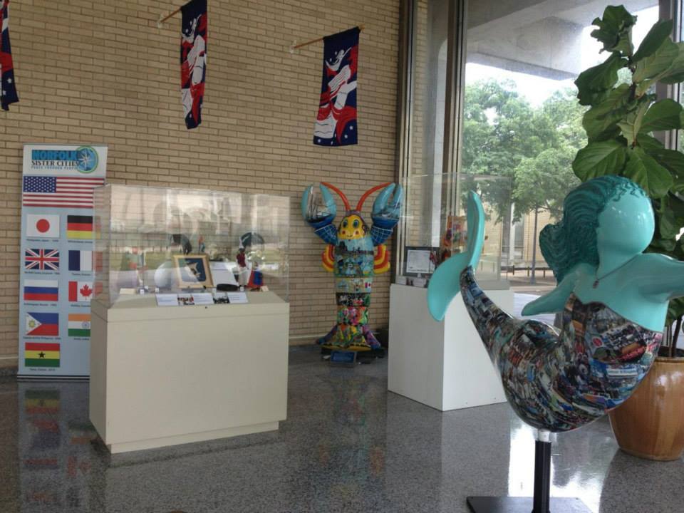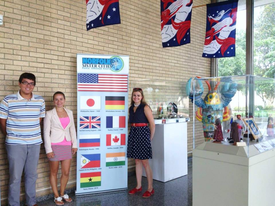 Norfolk Sister City Association (NSCA) Interns Zachary Fitzpatrick, Nikki Khmolovska, and Kara Broene worked on a display at Norfolk City Hall, showcasing gifts and artifacts from Norfolk’s nine sister cities and one friendship city. This includes everything from traditional dolls from French sister city Toulon to a music box from our newest friendship city, Ningbo-Beilun, China. If you’re in Downtown Norfolk, stop by the lobby at City Hall (810 Union Street) and have a look!
